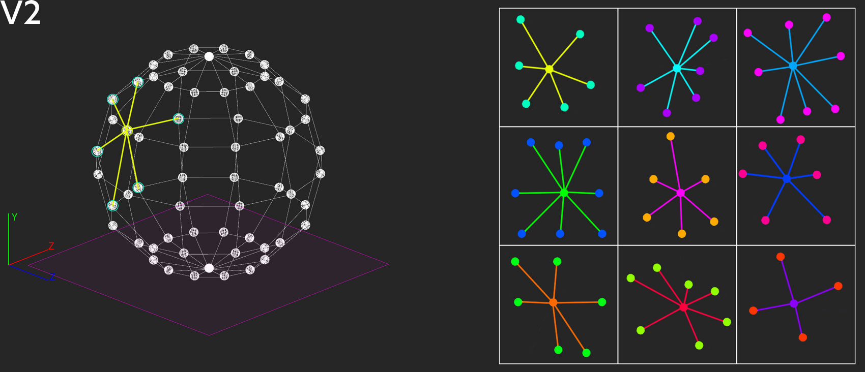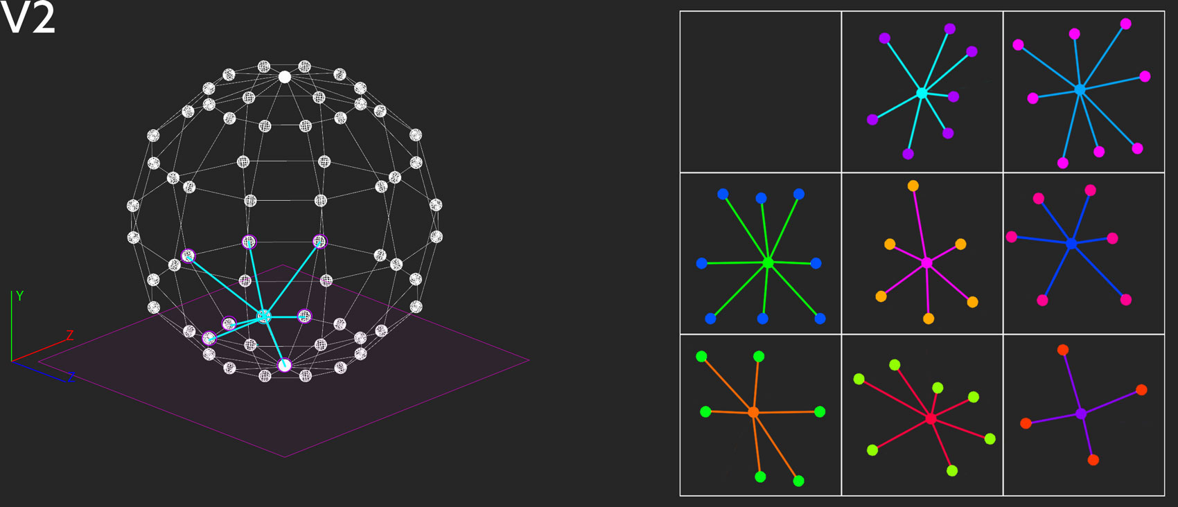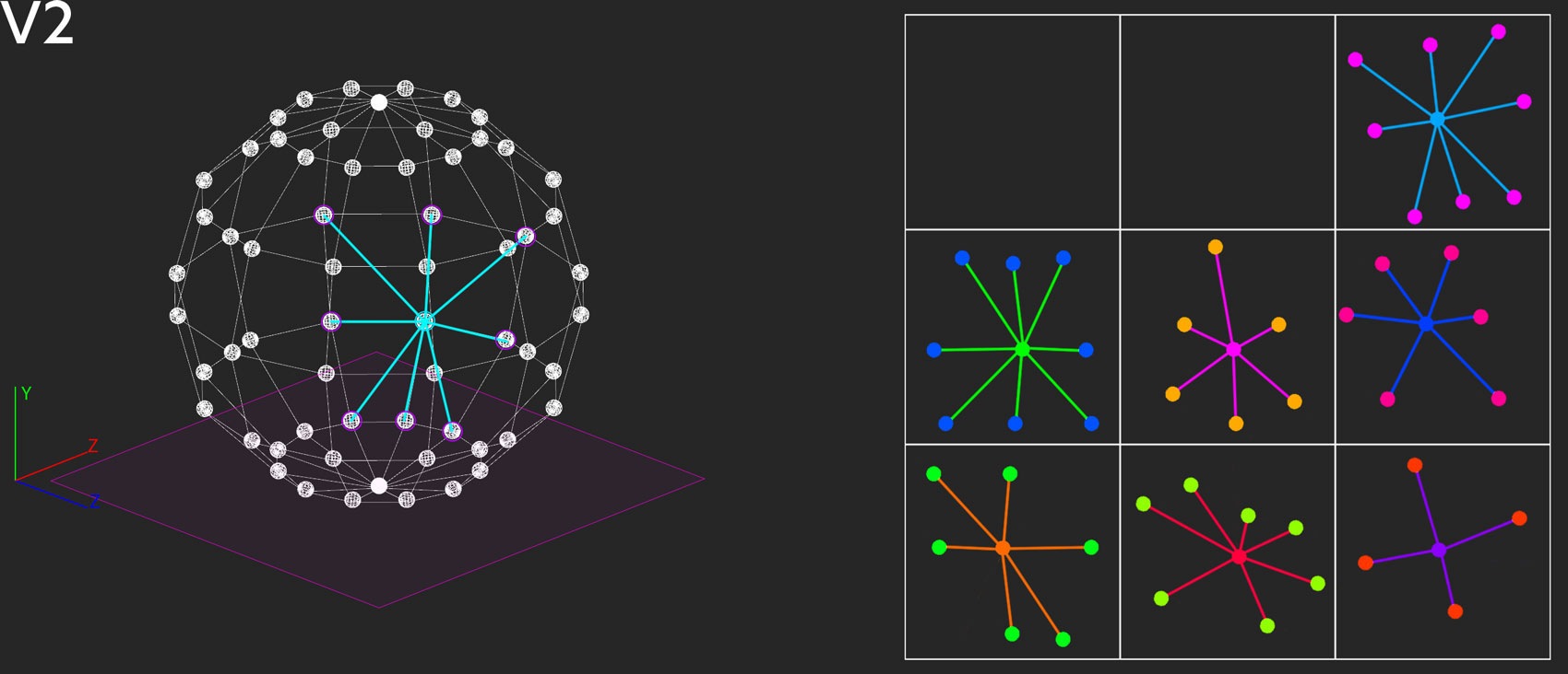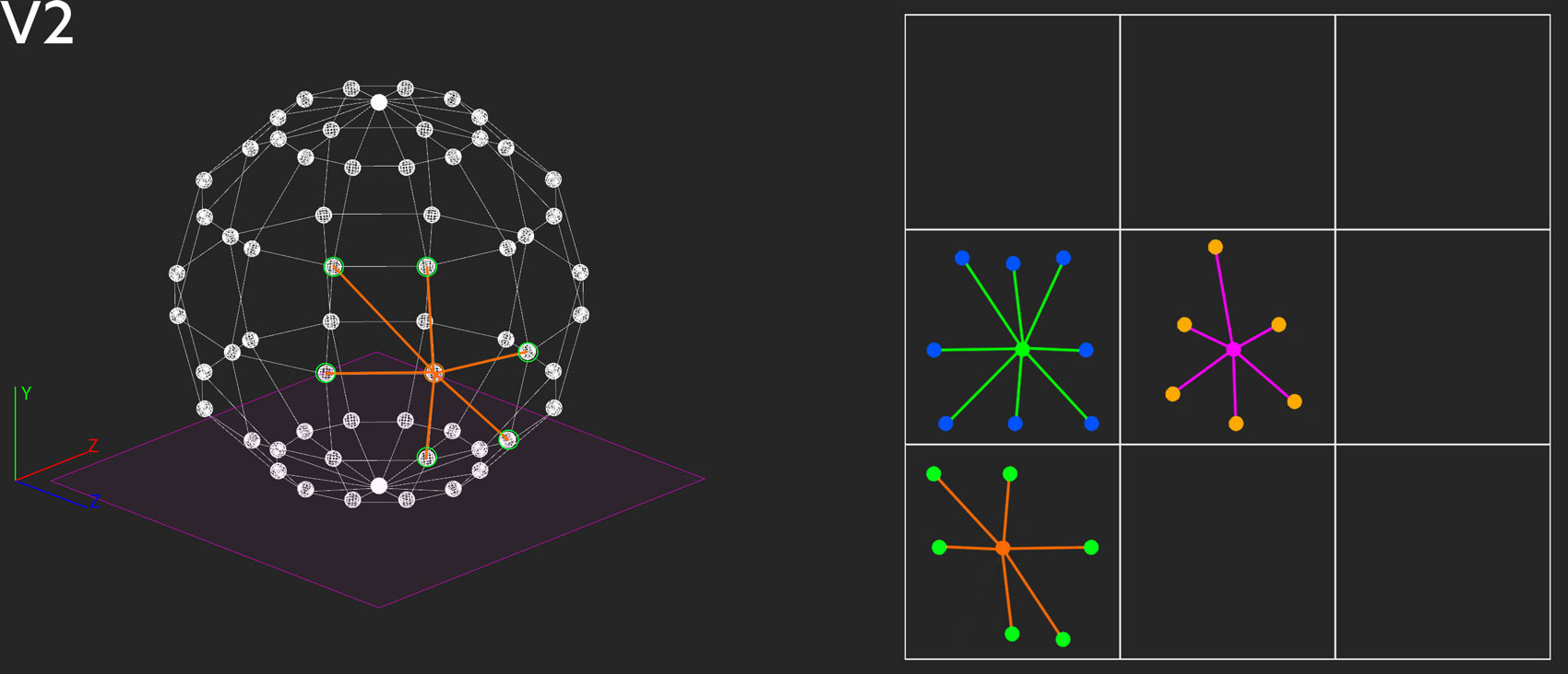 V1.1: To transfer the information from the sphere to the plane the method of dimensionality :reduction can be applied. (Please use arrows to navigate through the slides.) V1.2: Through the geometrical operation of projection all points of the 3D object are transferred orthogonally to the plane. V1.4: Let’s analyze three points according to their distance relations. We project them onto the plane like before. V1.5: But when we measure the distances between them a problem occurs: the relations of the distances for the same points differ considering the sphere and the plane. Due to the reduction of dimensionality the relations get distorted, and the results are less descriptive. V2.1: There is another method to display the content in two-dimensional form which does not rely on reduction. V2.2: Suppose we determine a point on the sphere and try to find the nearest neighbors. With a simple mathematical operation, the other points of the sphere can be arranged around the selected point according to their similarity/proximity. These relation can then be plotted in 2D. V2.3: The same operation is then performed for other points. Successively, the multitude of singular individual representations create a scan of the original sphere (similar to the 3D-scanning method of photogrammetry in which 3D objects are extracted from 2D photos. The more pictures from different angles, the more detailed the resulting 3D-scan). Contrary to the example of V1, this methods produces a induvial “map” for each single perspective.
